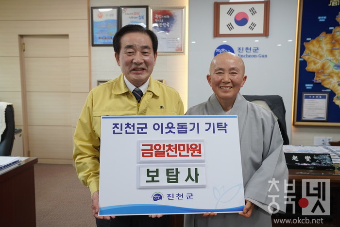 [충북넷=김택수 기자] 진천읍 소재 보탑사의 능현 주지스님이 21일 진천군청을 방문해 관내 저소득 아동을 위해 써달라며 성금 1천만 원을 기탁했다.