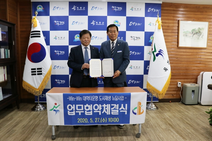 [충북넷=김택수 기자] 옥천군은 27일 군청 상황실에서 충북개발공사와 Win-Win 대학타운형 도시재생 뉴딜사업을 위한 업무협약을 하고 성공적인 추진을 위한 첫발을 내딛었다.