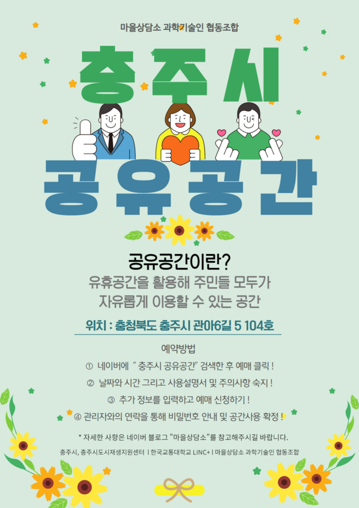 리빙랩 프로젝트(공유공간; 숨터같이)는 도시·교통공학전공 학생들로 구성된 마을상담소 협동조합(조합장 연제욱 4학년)이 직접 운영 주체로 활동하며, 충주의 원도심에 활력을 불어 넣을 수 있는 방안을 고민하여 내놓은 아이디어들로 원도심의 숨은 매력을 발굴하는 사업이다.