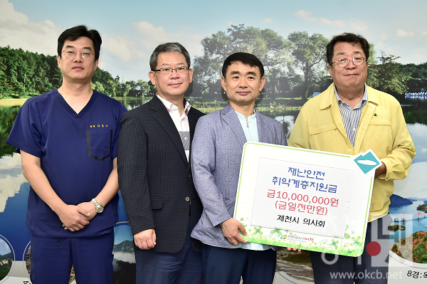 이날 제천시 의사회 이상학 회장(굿모닝정형외과의원)외 2명의 임원진(부회장 노창호, 총무 강중식)은 이상천 제천시장을 찾아 재난안전 취약계층 지원에 사용해 달라며 성금을 전달했다.