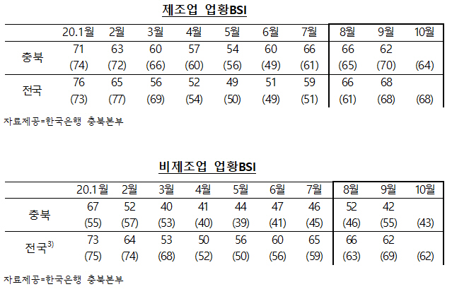 4일 한국은행 충북본부의 '2020년 9월 충북지역 기업경기조사 결과'에 따르면 제조업과 비제조업 모두 전달보다 업황BSI가 하락했다. 특히 10월 전망치도 전달보다 하락했다.
