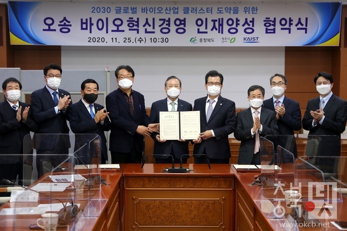 충북도와 청주시, KAIST는 11월 25일 충북도청(소회의실)에서 이시종도지사, 한범덕 청주시장, KAIST 신성철 총장 등이 참석한 가운데 ‘바이오혁신경영 인재양성사업’ 추진을 위한 업무협약을 체결했다.