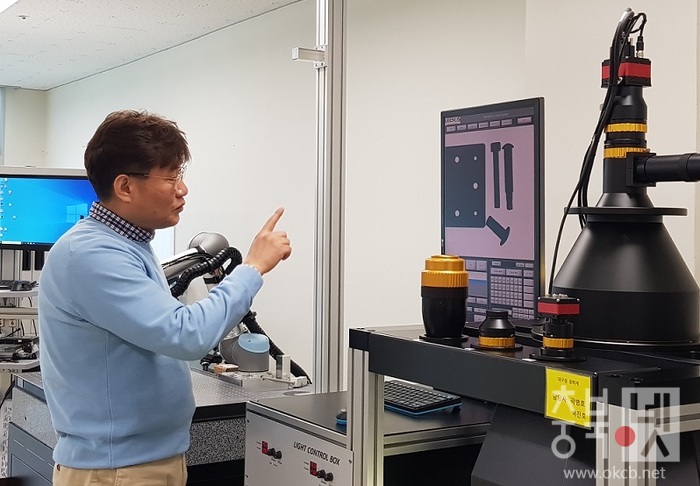 ![]() ▲ 리스광시스템 이성훈대표가 지역주력산업육성사업을 통해 개발한 'Telecentric Lens를 이용한 29M급 대면적 정밀 측정용 비전시스템'에 대해 설명하고 있다. © |