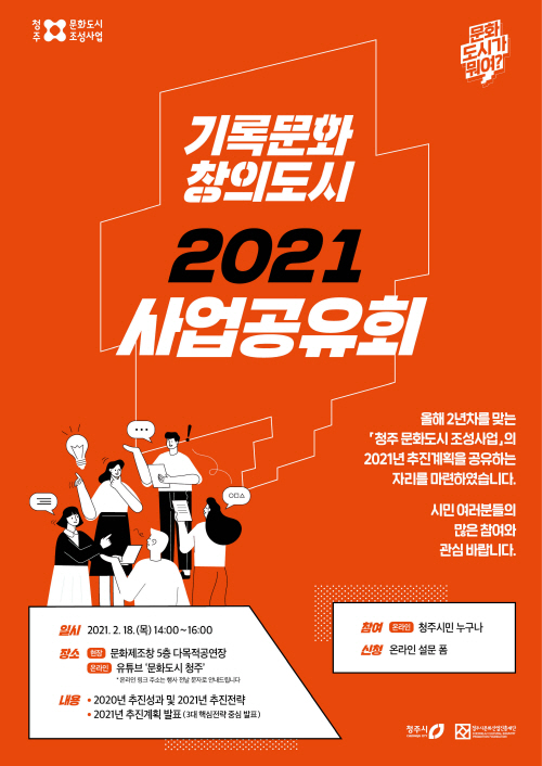 [충북넷=오홍지 기자] 청주시문화산업진흥재단(대표이사 박상언) 문화도시센터는 오는 18일 오후 2시, 유튜브 ‘문화도시 청주’채널에서 ‘2021 사업공유회’를 실시간 중계 한다고 16일 밝혔다.