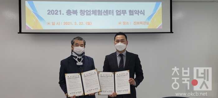 [충북넷=민정홍 기자] 충북도진로교육원(원장 이교배)이 22일 진로교육원내에서 충북창업체험센터(채움플러스 대표 유제완)와 업무협약을 맺었다.