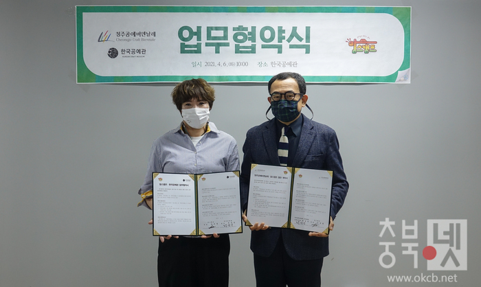 [충북넷=오홍지 기자] 2021 청주공예비엔날레(조직위원장 한범덕)와 국내 대표 공예 미술관 한국공예관(관장 박상언)이 6일 지역 최대 엄마들의 커뮤니티인 맘스캠프(대표 김선영)와 업무협약을 맺었다.