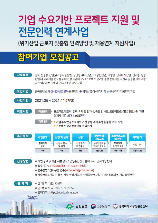 [충북넷=이규영 기자] 충북대학교(총장 김수갑) 공동훈련센터가 오는 21일까지 ‘위기산업 근로자 맞춤형 전문인력양성 및 채용연계 지원사업’에 참여할 5개사를 모집한다고 14일 밝혔다.