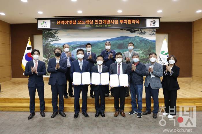 괴산군은 27일 군청 3층 대회의실에서 이와 관련 ㈜삼안, 이엠티씨㈜와 ‘산막이옛길 모노레일 민간개발사업 투자협약'을 맺었다.