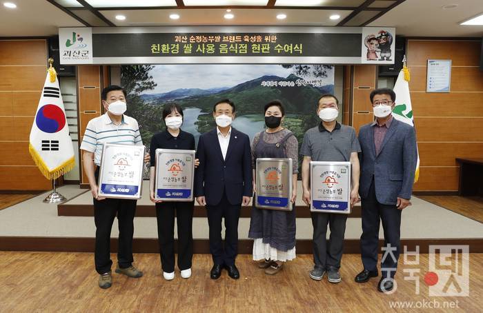 [충북넷=오홍지 기자] 괴산군이 13일 친환경 쌀 사용 음식점을 추가로 지정해 현판을 수여했다.