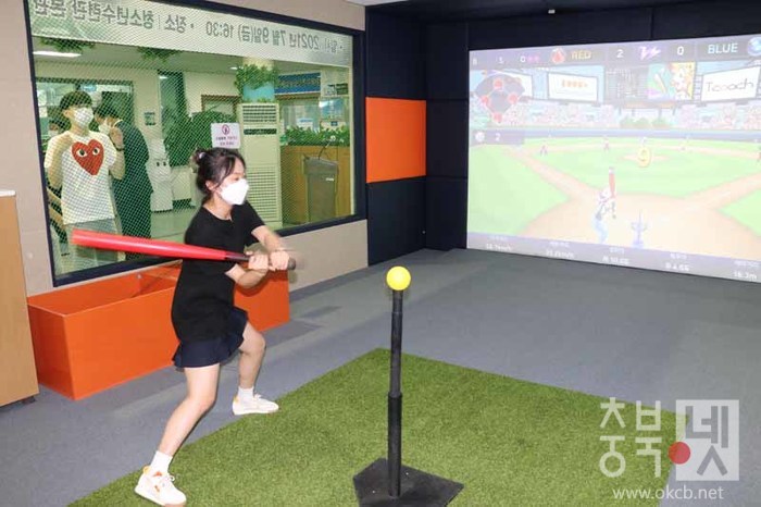 ▲ 한 청소년이 가상현실(VR) 스포츠실에서 야구 체험을 하고 있다. / 옥천군 제공 ©