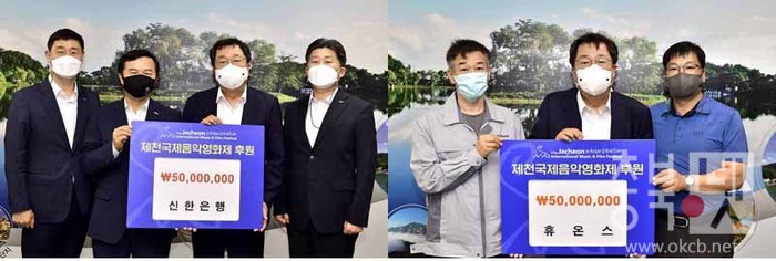 제17회 제천국제음악영화제가 안전하고도 즐거운 축제를 위해 심혈을 기울이고 있는 가운데, 신한은행 충북지사에서는 강영구 본부장이 참석해 5천만원 협찬금을, 휴온스에서는 고재천 전무가 참석해 5천만원의 협찬금을 이상천 제천시장(제천국제음악영화제 조직위원장)에게 전달했다.