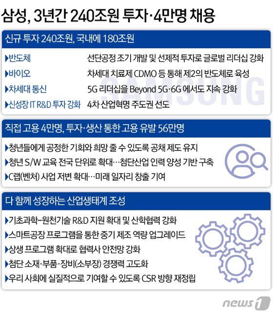 삼성전자를 비롯한 주요 관계사는 24일 △반도체·바이오 등 전략사업 주도권 확보를 위한 투자확대 △미래 세대를 위한 고용/기회 창출 △기초과학 원천기술 연구개발 지원 다 함께 성장하는 생태계 조성 등 크게 3개 분야로 나눈 투자 및 고용 계획을 발표했다.