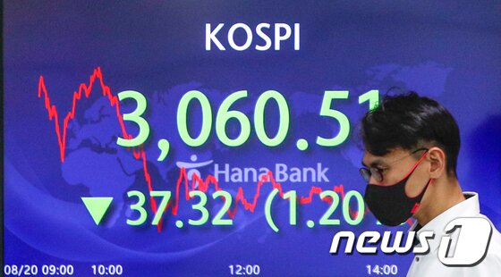 | 20일 오후 서울 중구 하나은행 딜링룸에 코스피 지수가 전 거래일보다 32.34포인트(1.2%) 내린 3060.51을 나타내고 있다. 코스닥 지수는 23.25p(2.35%) 내린 967.9로 거래를 마쳤다. 달러/원 환율은 3.4원 오른 1179.6원을 기록했다. 2021.8.20/뉴스1 © News1 안은나 기자 |