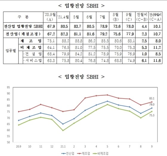 업황전망 SBHI는 신종 코로나바이러스 감염증(코로나19) 4차 대유행, 원자재 가격 급등 및 물류난 등의 영향으로 △6월 80.5 △7월 78.9 △8월 73.6 등으로 3개월 연속 하락세를 이어갔다. 그러나 다행히 백신접종 확대와 5차 재난지원금 지원 등으로 분위기가 전환됐다.