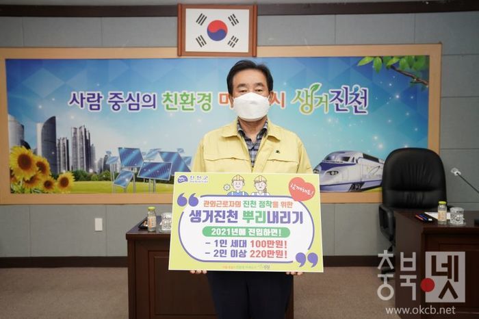 ![]() ▲ 송기섭 진천군수가 생거진천 뿌리내리기 사업 릴레이 홍보를 하고 있는 모습 / 진천군 제공 © |