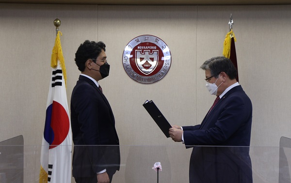 ![]() ▲ 김수갑 충북대총장이 신규임용교원에게 임용장을 수여하고 있다. 충북대. © |
