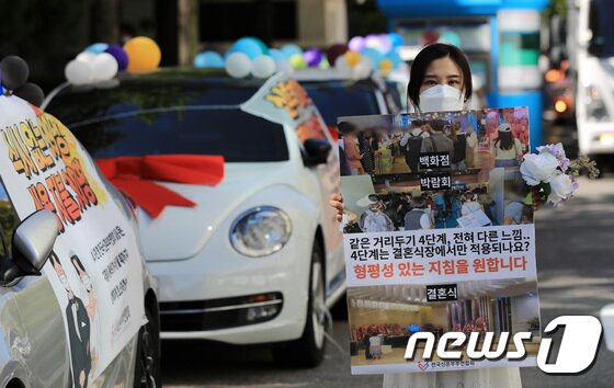 | 예비부부 등으로 구성된 전국신혼부부연합회 회원이 15일 오전 서울 영등포구 여의도공원 인근 공영주차장에서 정부의 신종 코로나바이러스 감염증(코로나19) 방역지침 개선을 촉구하며 '웨딩카 주차 및 1인 시위'를 하고 있다. 2021.9.15/뉴스1 © News1 구윤성 기자 |