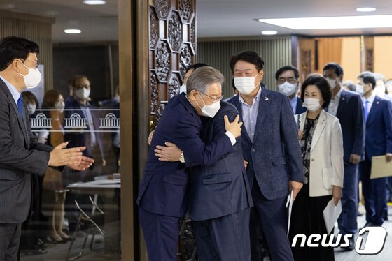 이재명 더불어민주당 대선 후보는 15일 민주당 의원들과 상견례하는 자리에서 의원 개개인과 일일이 악수하고, 허리를 90도 숙이며 인사를 하는 등 '낮은' 모습을 보였다. 경선 기간 경쟁했던 이낙연 전 대표 캠프의 좌장인 설훈 의원과 두 팔 벌려 포옹하는 등 화기애애한 분위기를 연출하며 '원팀' 의지를 드러냈다.