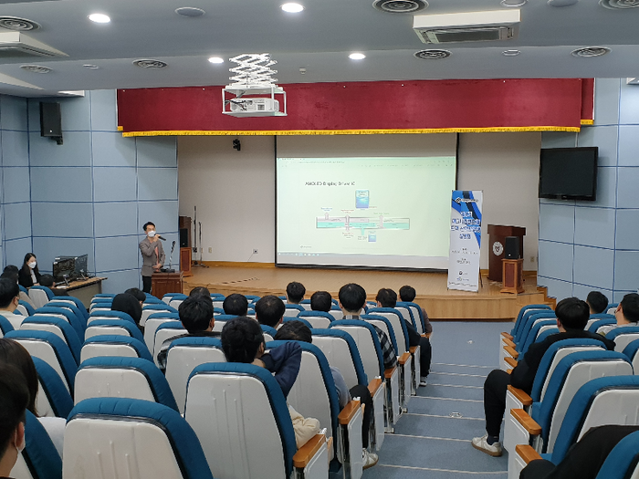 ![]() ▲ 지난 21일 충북대와 매그나칩반도체가 제 4기 매그나칩 반도체 트릭 장학생 설명회를 개최했다. 사진은 매그나칩반도체 김형규 수석이 Display driver IC 개발 및 직무 설명을 진행하는 모습. 충북대 제공 © |