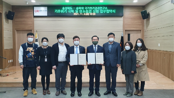 ![]() ▲ 충북대 국가위기관리연구소가 2일 충북연구원 대회의실에서 충청북도 환경산림국과 ‘기후위기·탄소중립 상호협력 업무 협약’을 체결했다. 충북대 제공 © |