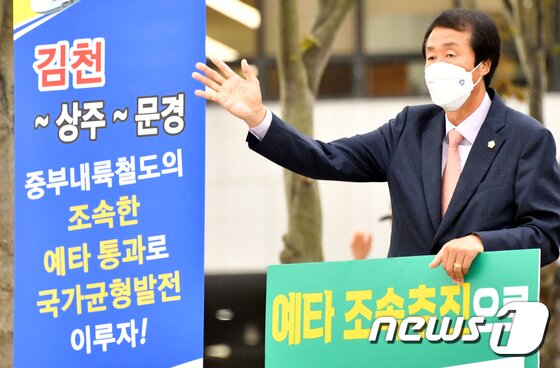 | 이우청 경북 김천시의장이 지난달 6일 세종시 한국개발연구원앞에서 문경~김천 구간 중부내륙철도의 조속한 시행을 촉구하며 1인 피켓시위를 벌이고 있다. 수서에서 부산과 거제를 잇는 국가 철도망 중 이 구간이 유일하게 미개통구간이다. (김천시의회 제공) 2021.10.6/뉴스1 © News1 정우용 기자 |