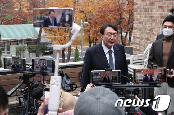| 윤석열 국민의힘 대선 후보가 21일 오후 서울 용산구 김한길 전 민주당 대표 사무실에서 김 전 대표와 회동한 후 취재진의 질문에 답하고 있다. 2021.11.21/뉴스1 © News1 국회사진취재단 |