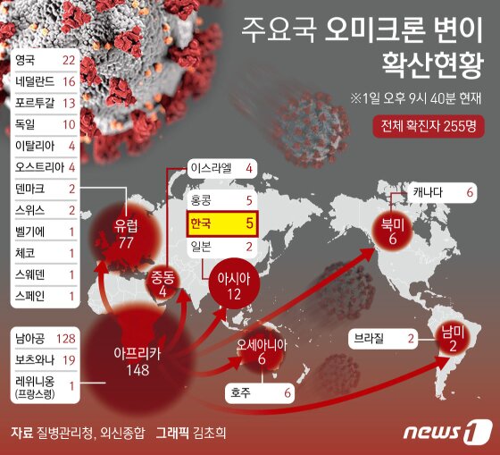 | 1일 오후 9시40분 질병관리청 중앙방역대책본부에 따르면 변이 확정을 위한 전장유전체 검사 결과 전날 오미크론 변이 감염 의심자로 분류됐던 40대 부부와 이들의 지인 1명, 해외 입국 확진자 2명을 더해 총 5명이 오미크론 변이에 감염된 것으로 최종 확인됐다. © News1 김초희 디자이너 |