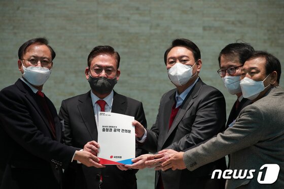 | 국민의힘 충청권 4개 시도당(충북, 충남, 대전, 세종) 위원장이 8일 서울 공군호텔에서 열린 국가균형발전 완성 결의대회에서 윤석열 후보에게 대통령선거 충청권 공약 건의문을 전달하고 있다. (충북도당 제공) © 뉴스1 |