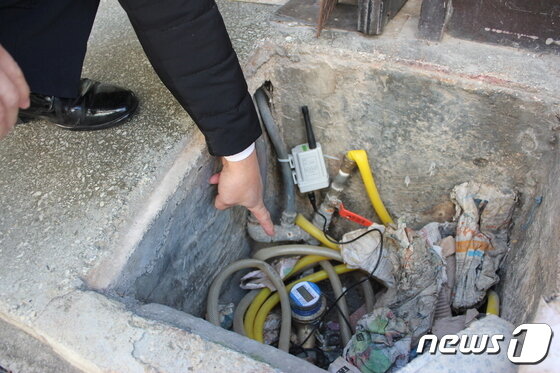 | 청주의 한 건물 출입구 수도계량기에 설치된 무선원격검침시스템© 뉴스1 |