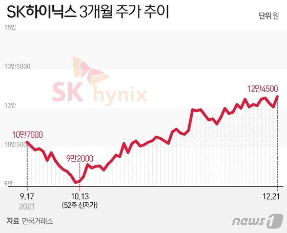 22일 한국거래소에 따르면 전일 SK하이닉스 주가는 4000원(3.32%) 오른 12만4500원으로 거래를 마쳤다. 이는 지난 7월 6일(12만5000원) 이후 5개월여만에 가장 높은 수준으로 연저점을 기록했던 지난 10월13일(9만500원)보다 37.5% 올랐다.