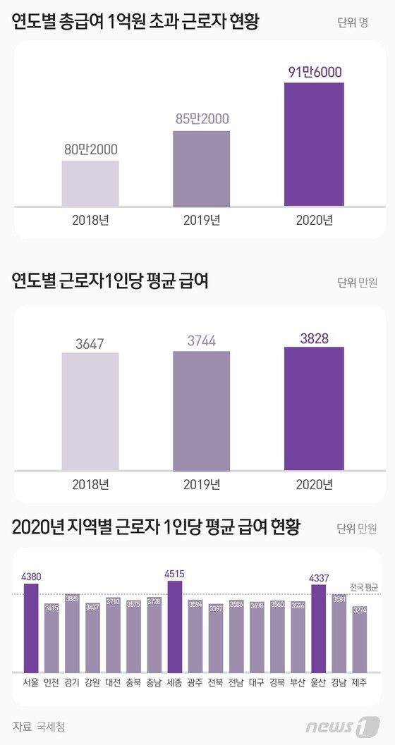 지난해 총 급여액이 1억원을 초과한 근로자가 91만명을 넘어선 것으로 나타났다. 평균 급여가 가장 높은 지역은 세종이었다.