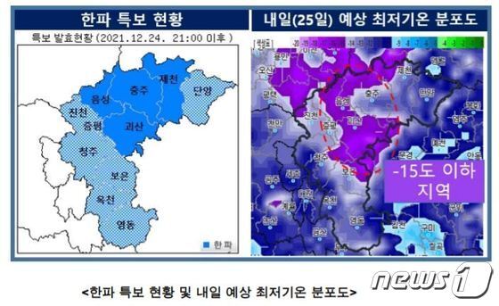 | 충북지역 한파특보 현황.(청주기상지청 제공).2021.12.24/© 뉴스1 |