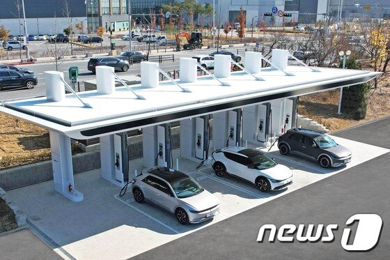| 전기차 충전소에 전기차들이 충전 중이다. /뉴스1 |
