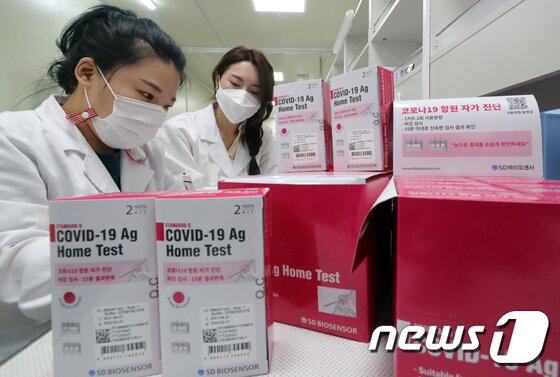 | 충북 청주시 오송읍 SD BIOSENSOR(에스디 바이오센서) 오송 공장에서 직원들이 시중에 판매할 코로나19 항원 자가진단 키트를 최종 점검하고 있다. 2021.4.29/뉴스1 © News1 장수영 기자 |
