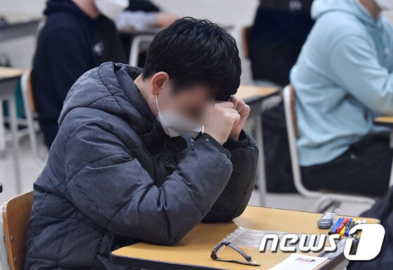 | 2022학년도 대학수학능력시험일인 11월18일 오전 서울 종로구 경복고등학교에서 수험생이 시험 시작을 기다리며 생각에 잠겨 있다. 2021.11.18/뉴스1 © News1 사진공동취재단 |