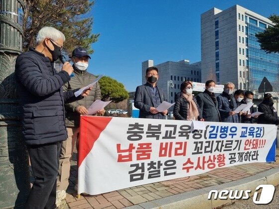 충북자유민주시민연합은 8일 청주지검 앞에서 기자회견을 열고 "검찰은 충북도교육청의 납품 비리 의혹 수사를 조속히 진행하라"고 촉구했다. © 뉴스1