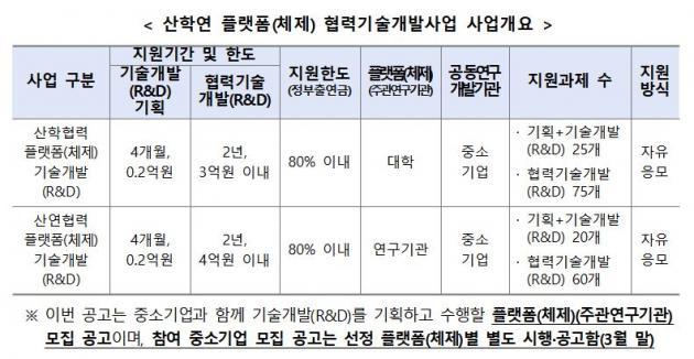![]() ▲ 중소벤처기업부가 13일 공고하는 ‘산학연 플랫폼(체제) 협력기술개발사업’ 사업개요 © |