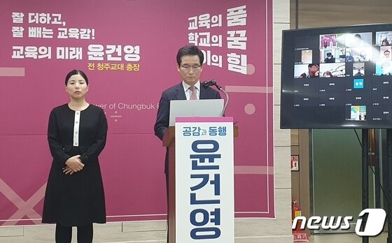| 윤건영 전 청주교육대 총장이 19일 오전 충북교육청에서 기자회견을 열고 18대 충북교육감 선거 출마를 선언하고 있다.2022.1.19.© 뉴스1 |