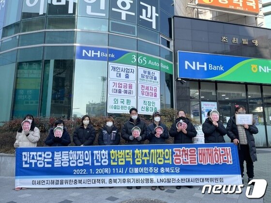 | 미세먼지 해결을 위한 충북시민대책위원회 등 충북지역 환경단체들이 20일 청주시 청원구 율량동 더불어민주당 충북도당 당사 앞에서 한범덕 청주시장의 공천 배제를 요구하는 기자회견을 열고 있다.(미세먼지 해결을 위한 충북시민대책위원회 제공).2022.1.20/© 뉴스1 |