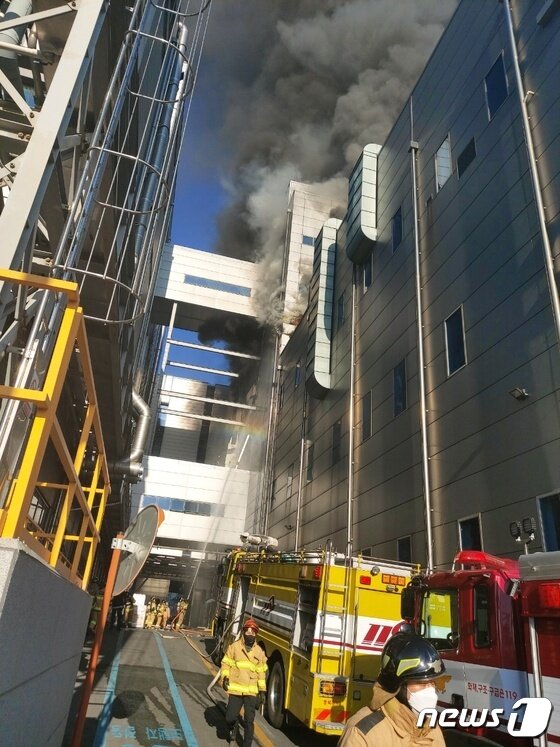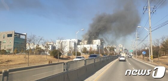| 21일 오후 3시쯤 충북 청주시 청원구의 한 2차 전지 제조업체에서 원인을 알 수 없는 불이 나 연기가 올라오고 있다.(충북소방본부 제공).2022.01.21/© 뉴스1 |