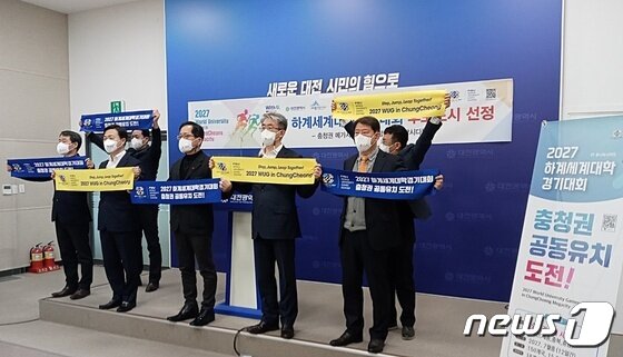 | 충청권 4개 시·도로 구성된 ‘2027 하계세계대학경기대회’ 공동유치위원회가 26일 대전시청에서 국제대학스포츠연맹(FISU)으로부터 후보도시로 공식 선정된 기념해 유치 성공을 다짐하는 퍼포먼스를 하고 있다. ©뉴스1 최일 기자 |