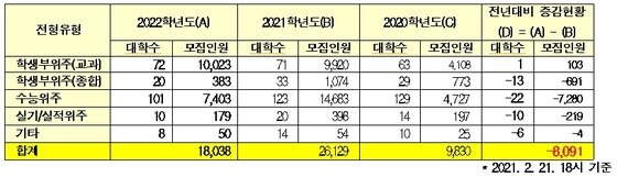 이날 한국대학교육협의회(대교협) 따르면 2022학년도 대입 추가모집에서 141개교가 1만8038명을 뽑는다. 지난해 162개교, 2만6129명과 비교해 8091명 감소했다.