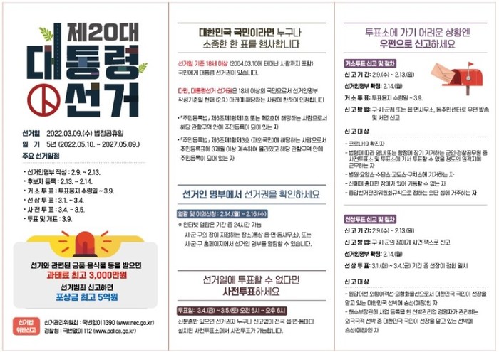 오는 3월 9일 실시하는 대통령선거와 관련해 선거일에 투표를 할 수 없는 유권자는 누구든지 별도의 신고 없이 신분증을 지참하고 읍‧면‧동에 설치된 사전투표소 어디에서나 투표를 할 수 있다.