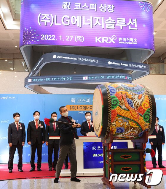 | 27일 오전 서울 여의도 한국거래소에서 열린 LG에너지솔루션의 코스피 신규상장 기념식에 참석한 권영수 LG에너지솔루션 대표이사가 상장 기념 북을 치고 있다. 2022.1.27/뉴스1 © News1 조태형 기자 |