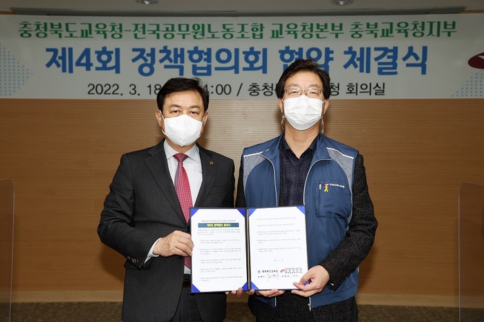 충청북도교육청(교육감 김병우)은 코로나19로 연기됐던 전국공무원노동조합 교육청본부 충북교육청지부(이하 전공노 충북교육청지부)와 제4회 정책협의회 협약 체결식을 18일 충청북도교육청 회의실에서 개최했다고 발표했다.