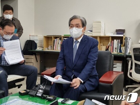| 노영민 전 대통령 비서실장이 28일 충북도청 기자실에서 충북지사 출마를 공식화하고 있다. © 뉴스1 |