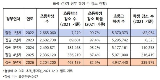 홍 팀장은 "이번 정부 5년은 앞으로 10년 동안 초등학생의 60%가 줄어들 수 있는 최악의 상황까지 철저히 준비해야 한다"라며 "5년 동안 제대로 준비하지 않으면 학생 수 감소의 파도가 중학교, 고등학교 그리고 대학에 영향을 미칠 것이고 그때의 사회적 혼란은 심각한 수준이 될 것"이라고 덧붙였다.
