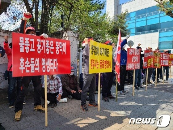 | 충북 청주시 동막동 폐기물처리시설 저지 비상대책위원회가 11일 청주시청 임시청사 앞에서 집회를 열고 청주하이테크밸리 폐기물 처리시설 축소 이전을 촉구하고 있다.2022.4.11/© 뉴스1 강준식 기자 |