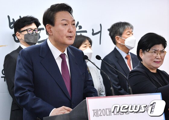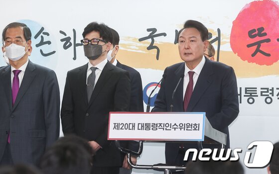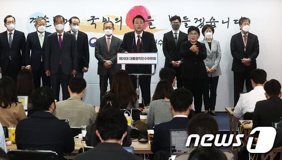 | 윤석열 대통령 당선인이 13일 오후 서울 종로구 통의동 인수위 공동기자회견장에서 새 정부 2차 인선 결과를 발표하고 있다. 2022.4.13/뉴스1 © News1 인수위사진기자단 |