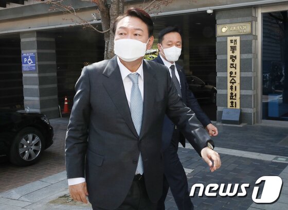 | 윤석열 대통령 당선인이 7일 한미연합사 방문 일정을 소화한 후 서울 종로구 통의동 인수위 집무실로 들어서고 있다. 2022.4.7/뉴스1 © News1 인수위사진기자단 |